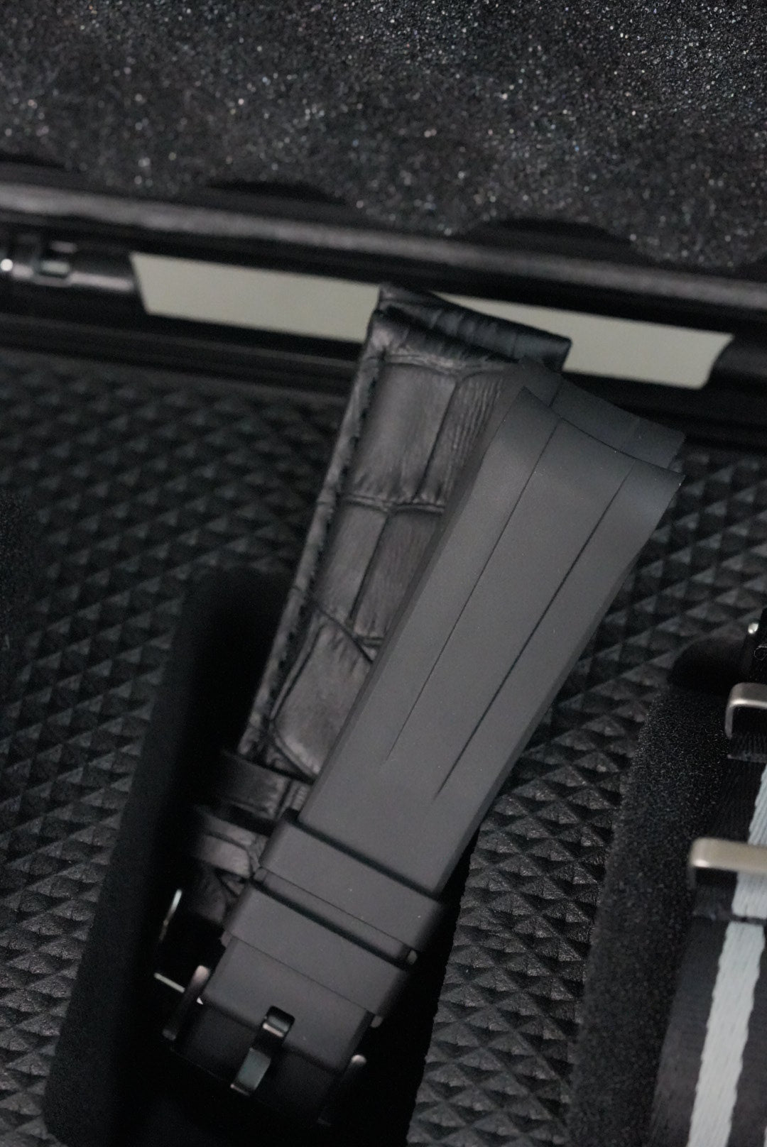• Curved-End Matte Black FKM Rubber Strap – Military-grade comfort and precision fit for an active lifestyle.