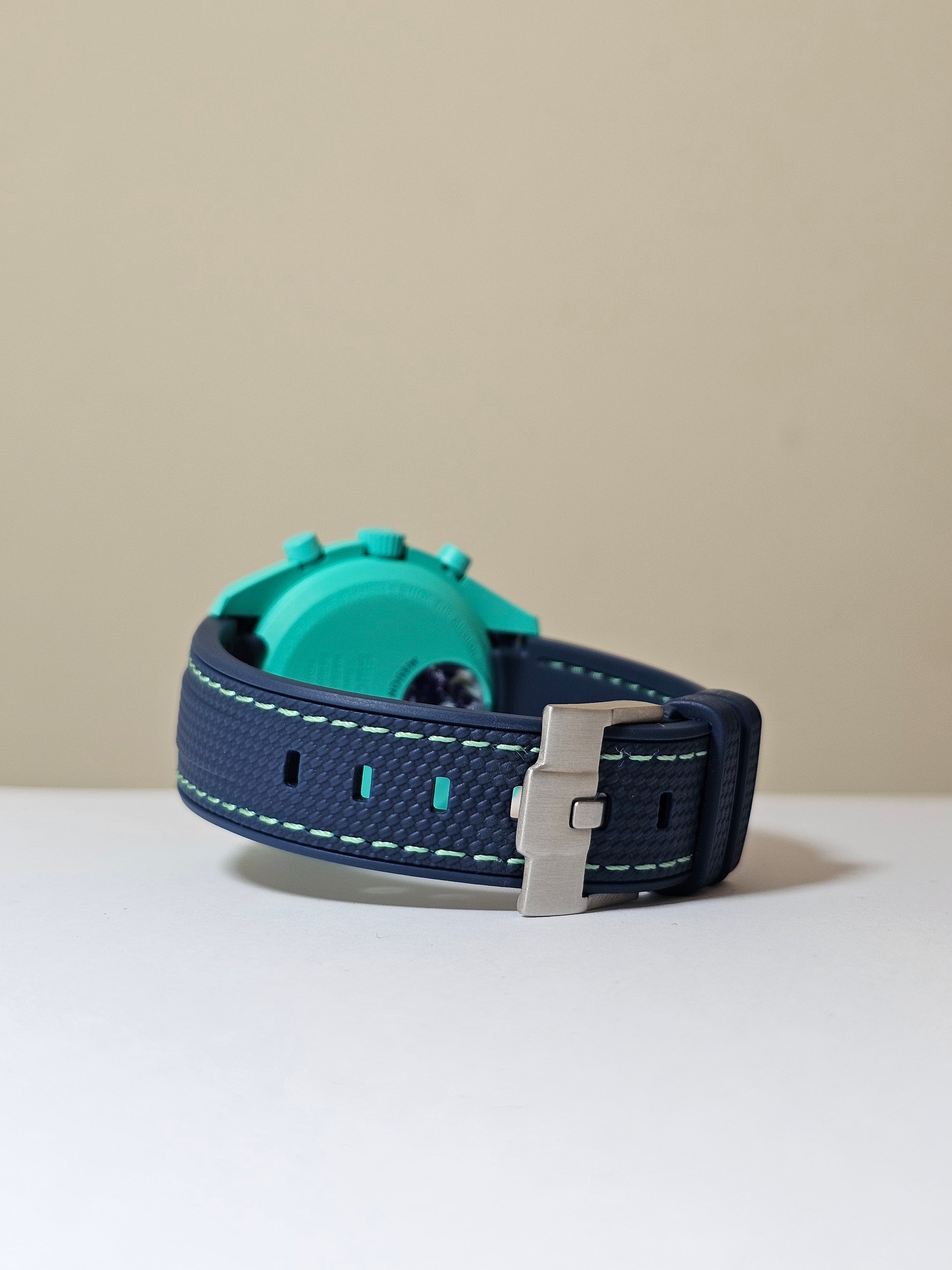 Rubber Curved Strap for Omega x Swatch MoonSwatch – Mission on Earth – Navy with Green Stitch