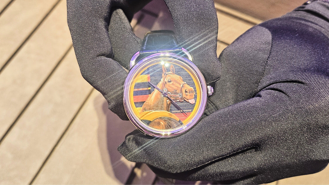 Hermès Arceau Rocabar de Rire watch featuring a dial crafted from real horsehair marquetry, depicting a playful horse with animated tongue function, launched as a 12-piece limited edition at Watches & Wonders 2025.The Arceau Rocabar de Rire