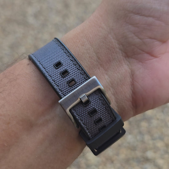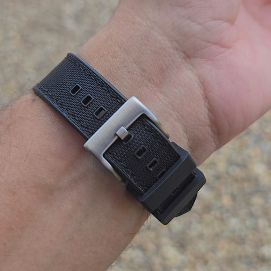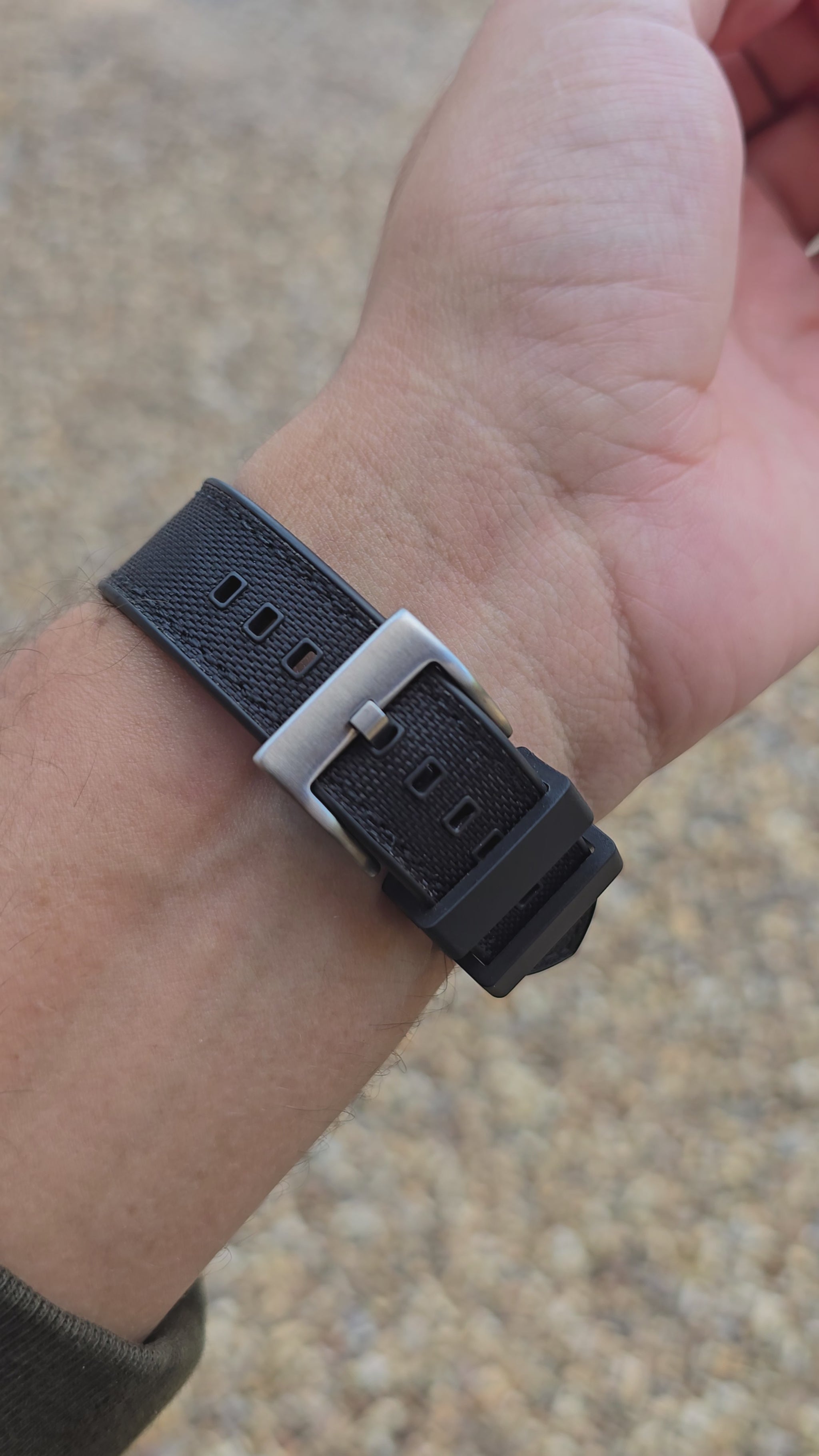 Built for everyday wear and rugged enough for adventure, this Sailcloth FKM Rubber Strap is designed to complement the Swatch x Omega MoonSwatch. It features a textured sailcloth-style upper fused to a durable FKM rubber base, offering the best of both materials — structure, flexibility, and water resistance.