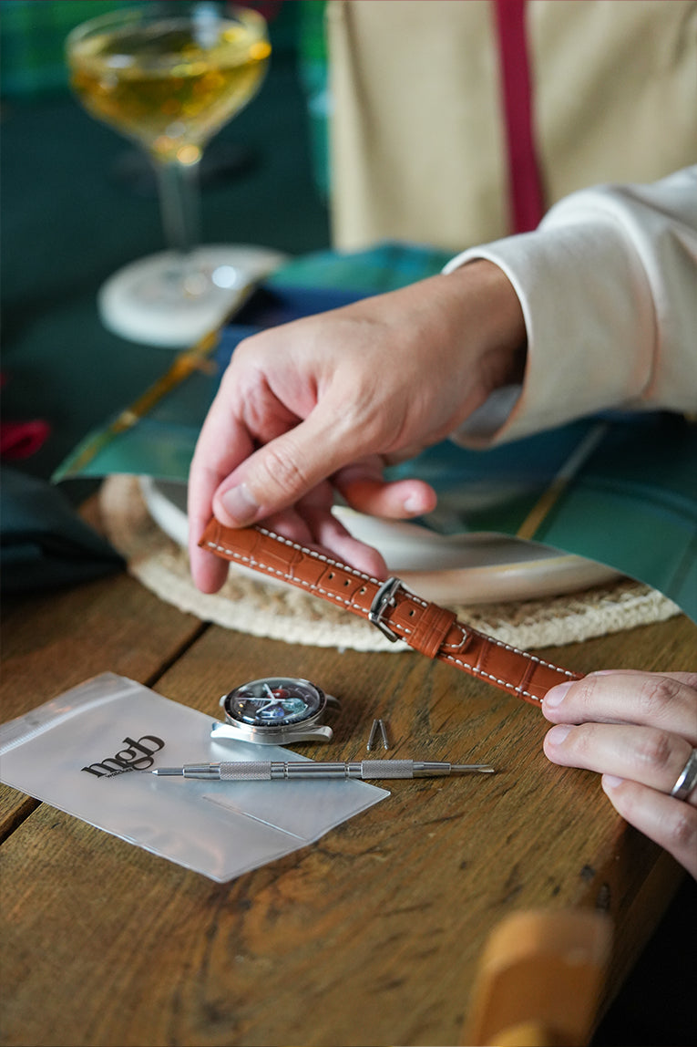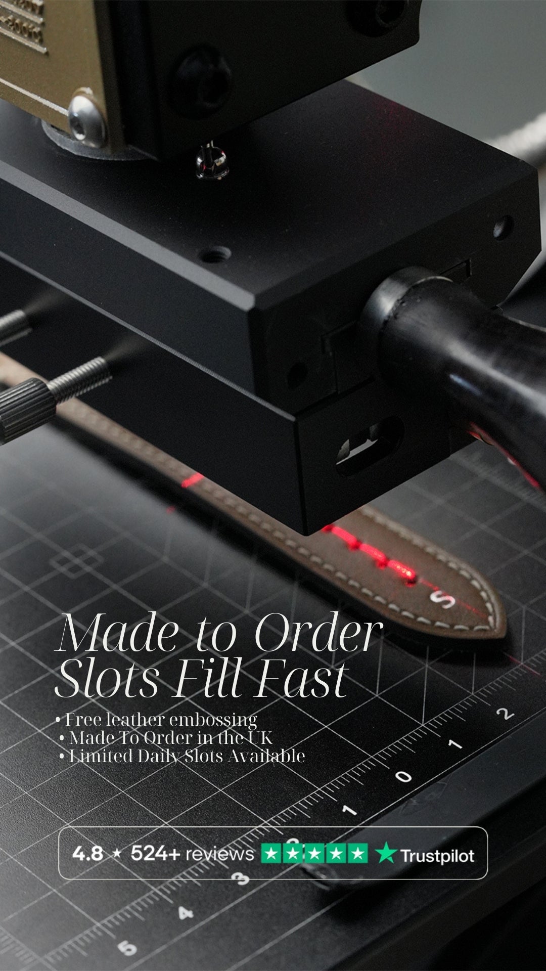 Explore Leather EmbossingPersonalise the tip of your strap with a single initial. Select blind embossing for an understated impression, or opt for silver or gold foil for a sharper, more elevated look. A simple detail that adds individuality and character to every strap.