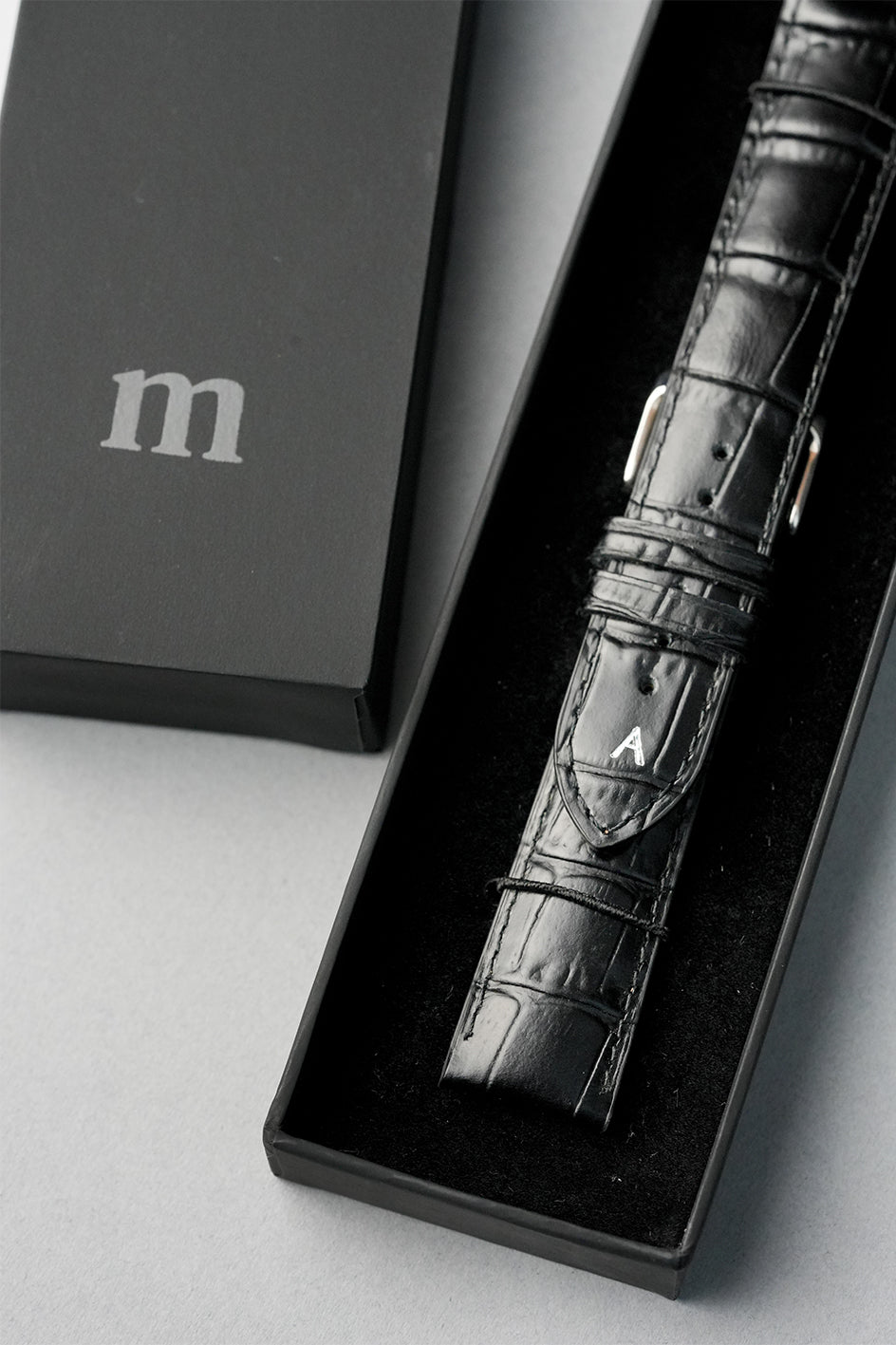 Every embossed strap is prepared and finished in our in-house atelier. Each order is made to order, with every letter or symbol carefully hand-pressed into the leather. This process means that no two embossed straps are ever identical. The depth, the finish, and the natural texture of the leather combine to create a strap that is as individual as its owner.