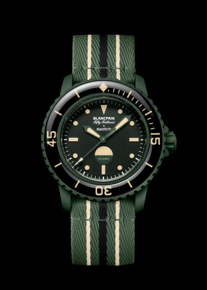 The Blancpain x Swatch Bioceramic Scuba Fifty Fathoms: Green Abyss Edition is a masterful blend of heritage and innovation. Crafted with a 42.3mm matte green Bioceramic case, this timepiece pays homage to the iconic Fifty Fathoms dive watch. Its unidirectional rotating bezel, featuring a black resin insert with Grade A Super-LumiNova®, ensures optimal legibility underwater Powered by Swatch's revolutionary SISTEM51 mechanical movement, the watch boasts a 90-hour power reserve and anti-magnetic properties, thanks to its Nivachron™ hairspring. The transparent sapphire caseback reveals a vibrant digital print of the Felimare picta nudibranch, symbolizing the ocean's wonders. The two-piece NATO-style strap, made from recycled fishing nets, underscores the watch's commitment to sustainability. With a water resistance of 91 meters (50 fathoms), the Green Abyss is both a functional dive watch and a statement piece for eco-conscious adventurers.