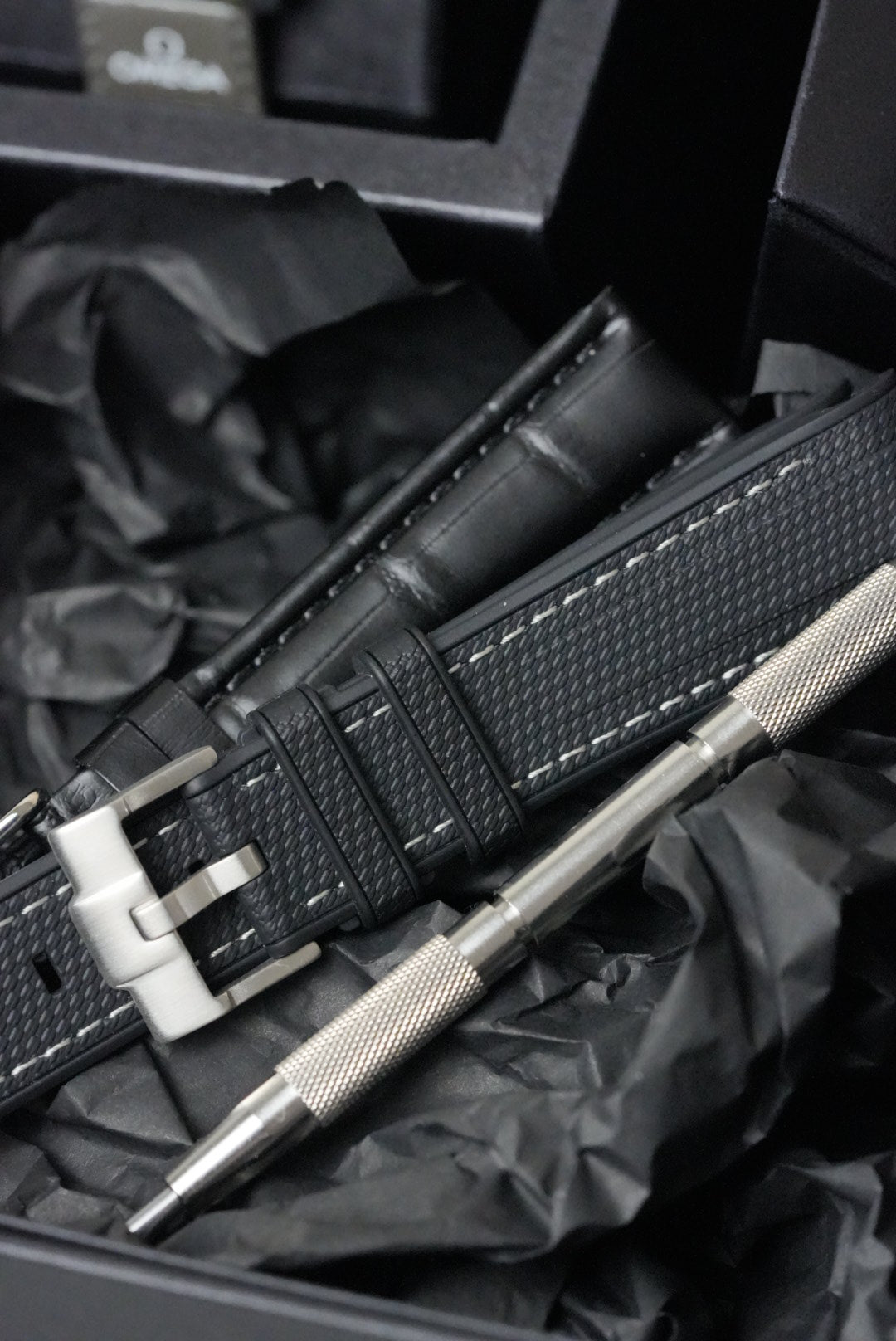 • Black Embossed Leather Strap with White Contrast Stitching