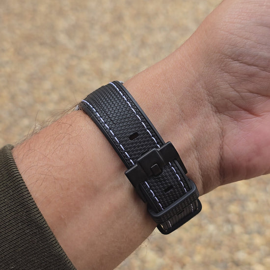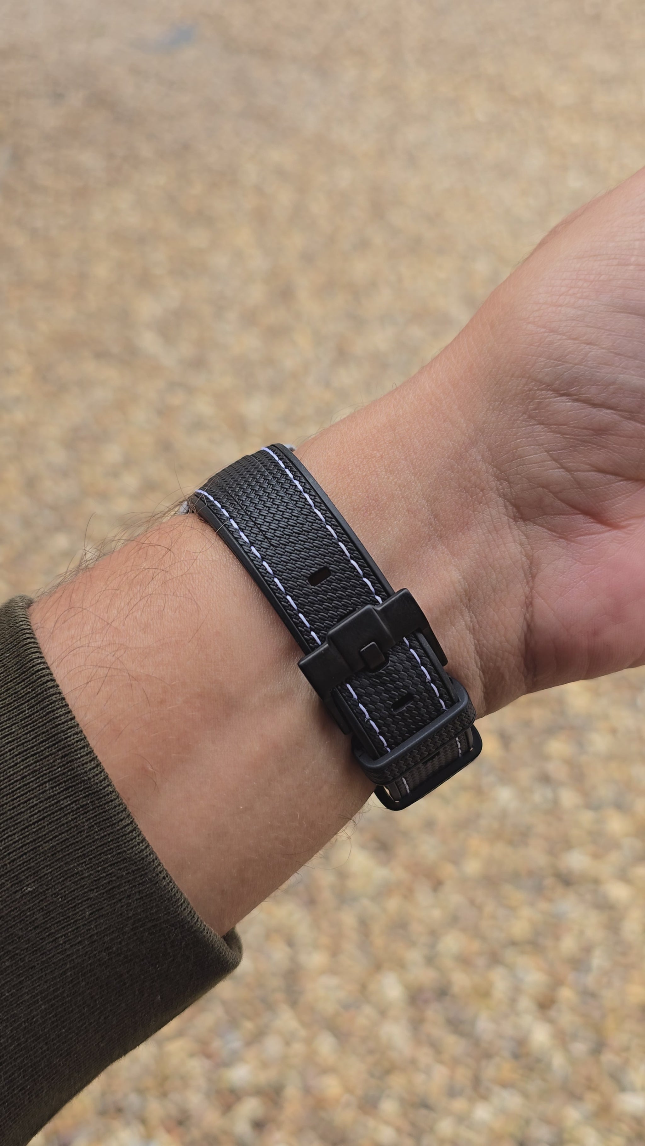 Our Black Rubber Woven Strap with White Contrast Stitching is one of MGB Watches’ best-selling straps — a customer favourite that pairs timeless styling with precision design. Crafted from high-grade silicone rubber, this strap delivers exceptional flexibility, durability, and comfort while offering a distinctive look that complements both casual and collector wear.