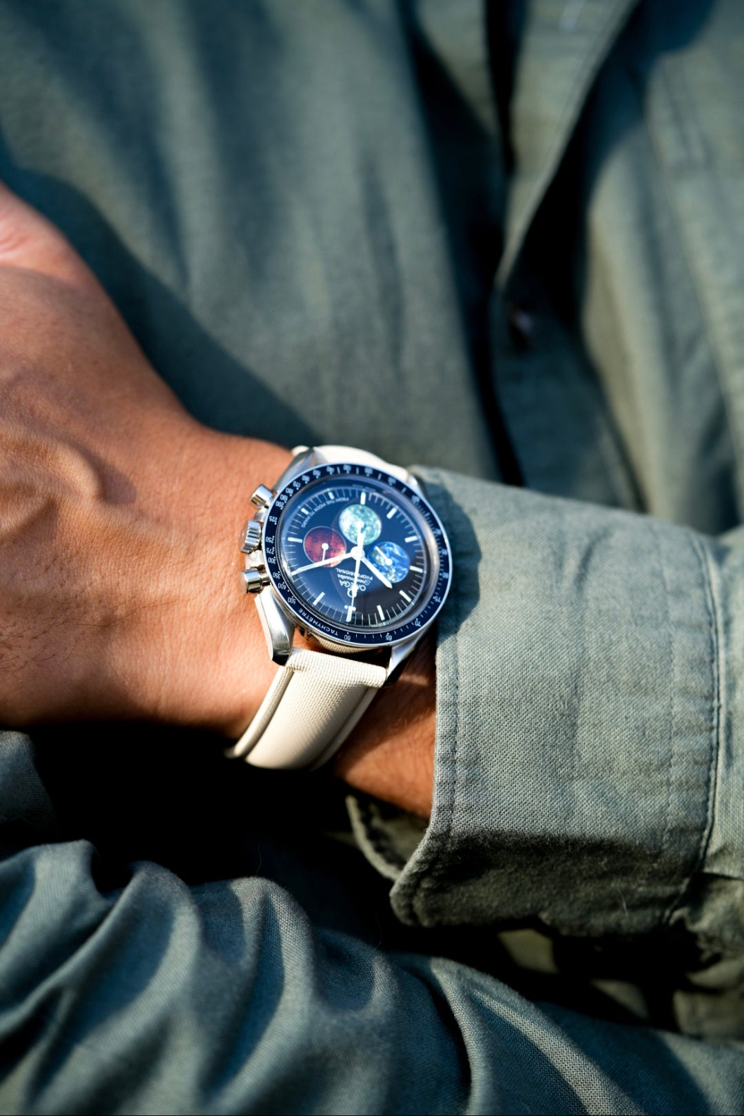 Classic sailcloth style, engineered for modern Speedmasters. This strap offers the textured look of sailcloth with the comfort, flexibility and water resistance of high-grade FKM rubber. It’s built for everyday wear, from the office to the outdoors.