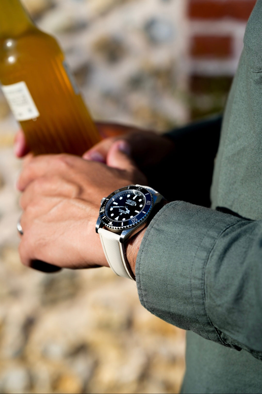 This sailcloth-effect strap is engineered specifically for the Rolex Submariner, offering the classic textured finish of sailcloth with the durability, flexibility, and water resistance of high-performance FKM rubber. Fitted with a brushed deployant clasp for a clean wrist profile, it's designed for everyday wear with no compromise on style or comfort.